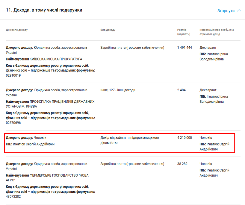 Складається враження, що адвокатська діяльність голови родини — не стільки бізнес, скільки зручна ширма, яка дозволяє пояснити походження сімейних статків, які кратно збільшилися після призначення пані Ігнатюк на посаду заступника начальника управління в столичній прокуратурі: за даними її декларацій, за 2024 рік адвокат отримав 4 млн. 200 тис. грн. доходу, що вчетверо більше ніж у 2023 році, а в 2022 році Сергій Ігнатюк взагалі показав символічні 10 000 грн. доходу. Цікаво, який дохід буде ним задекларовано за 2025 рік?